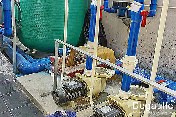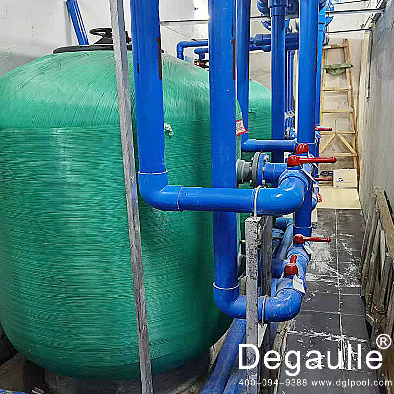 在游泳池过滤系统中,采用2套定制法兰式砂缸头、2台深层玻璃纤维过滤器,流量:42m³/h,过滤面积:1.13㎡、2台扬程13m的专业循环水泵、2台扬程12m的溢流循环泵(1用1备)。