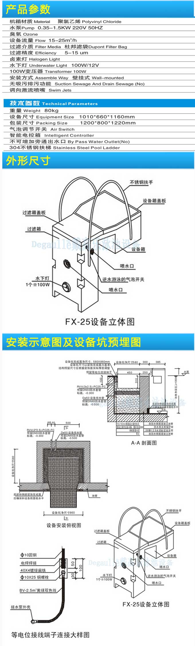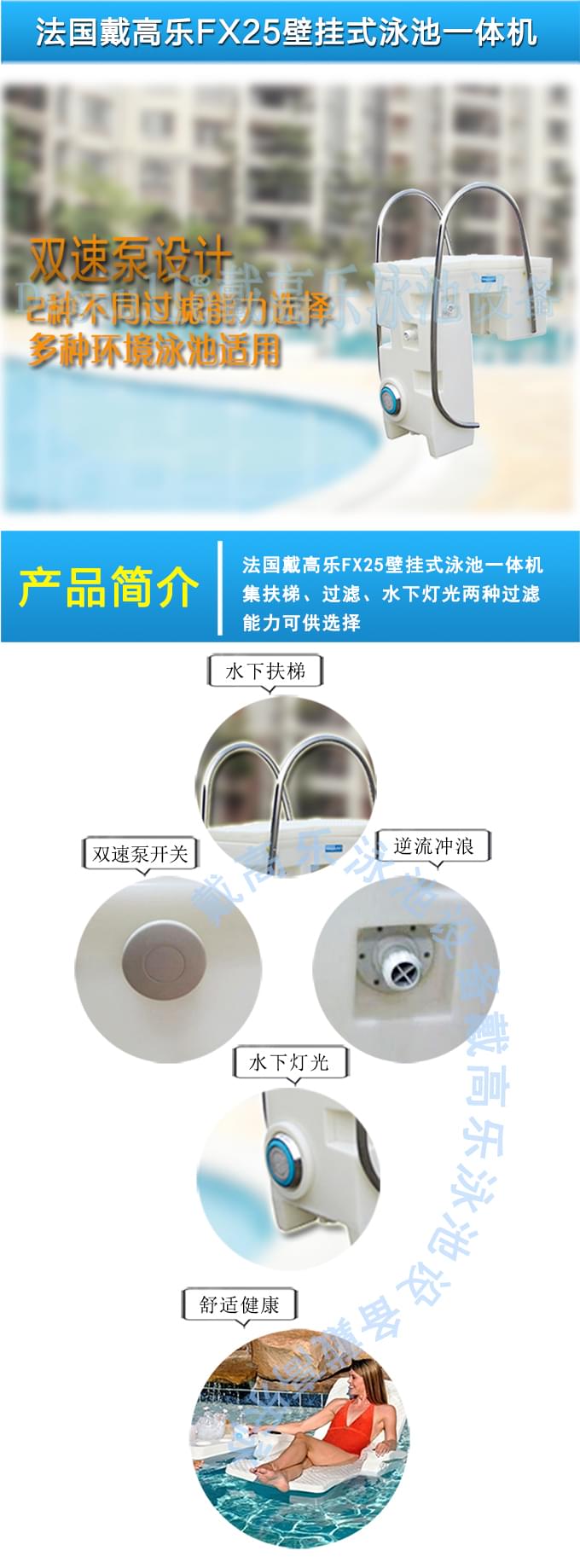 戴高乐系统产品,拥有30多种款式,按安装方式分有壁挂式,平嵌式,台阶式,地埋式,水疗梯等五种款式;按过滤介质分有:石英沙过滤(最传统的过滤介质,全球认可),聚酯滤芯(欧美国家偏爱)过滤,PP专用杜邦滤袋(法国和中东国家偏爱)过滤等三种无机房泳池过滤系统。